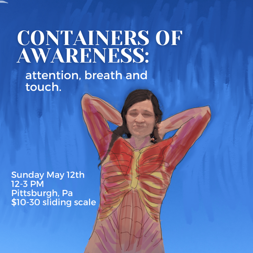 In this three hour in person workshop we will navigate the terrain of the complex relationships of the nervous system, diaphragm, touch and a felt sense of safety using our attention and awareness. We will inquire into our own unique somatic sense of self through experiential exercises, conceptual content, and discussion. There will be an exploration of self-massage of the ribcage as a container and an exploration of our container with others through coregulation in pairs work. There will be some educational pieces around the felt sense of safety of the nervous system and a conceptual framework to test against your own experience of attention and awareness. There will be space for the group body to express itself!